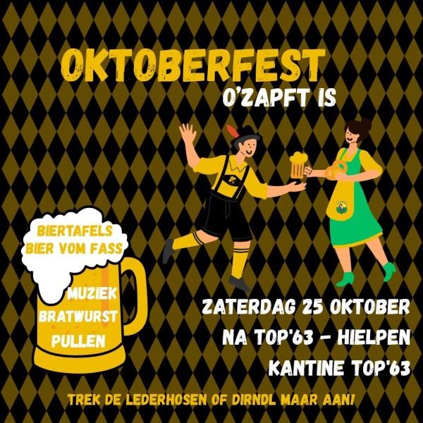 Zaterdag 25 oktober is het weer zo ver: het Oktoberfest bij Top ’63! Vanaf 16:30 uur verandert onze kantine in een stukje Beieren met een flinke vleug Hollandse gezelligheid.